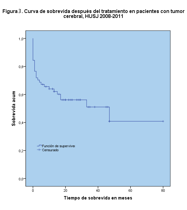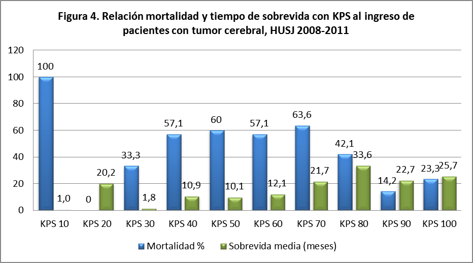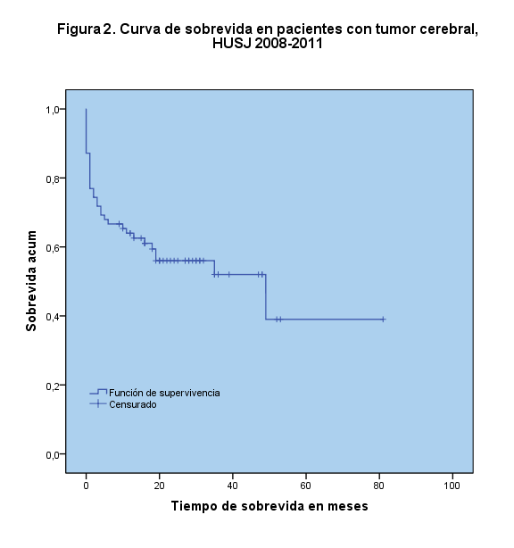 Objetivo: determinar las características demográficas, frecuencia, métodos diagnósticos, mortalidad, supervivencia, y tratamiento de pacientes con tumores cerebrales en el Hospital Universitario San Jorge de Pereira, Risaralda, Colombia. Materiales y métodos: Se realizó un estudio descriptivo retrospectivo, en el cual se tuvo en cuenta 78 historias clínicas de pacientes que ingresaron al Hospital Universitario San Jorge entre los años 2008-2011, con diagnóstico de tumor cerebral, de ellas se analizaron y compararon con estudios nacionales e internacionales datos demográficos, clasificación del tumor según la Organización Mundial de la Salud (OMS), método diagnóstico, hallazgos positivos en la Tomografía Axial Computarizada simple y contrastada, Imagen por Resonancia Magnética Cerebral y biopsia, localización del tumor, tratamiento recibido (cirugía, quimioterapia y radioterapia), sobrevida y funcionalidad del paciente mediante la escala de Karnofsky. Resultados: De los 78 pacientes el 62,8% eran hombres, la edad promedio fue 45,9 años, con una moda de 35, los tumores más frecuentes fueron el glioblastoma multiforme y el tumor metastásico (17,9% cada uno), el tratamiento de elección fue la cirugía (80,8%), seguido de la radioterapia (29,5%) y la quimioterapia (17,9%). La mortalidad fue del 45% con una sobrevida de 3,4 años (DE 1,2). El 51% de los pacientes que ingresaron con Karnofsky menor de 70 murieron. Discusión: La supervivencia de los tumores cerebrales en el Hospital Universitario San Jorge es mayor a la esperada por la OMS, la cirugía fue el tratamiento de elección junto a tratamiento complementario con radioterapia y quimioterapia, incrementando la sobrevida; la Tomografía Axial Computarizada se usó en todos los pacientes por su disponibilidad, precisión y costo-efectividad para este medio, la biopsia es una herramienta necesaria para el diagnóstico definitivo del tipo de tumor y la escala funcional de Karnofsky se podría utilizar como factor pronóstico de mortalidad en tumores cerebrales.