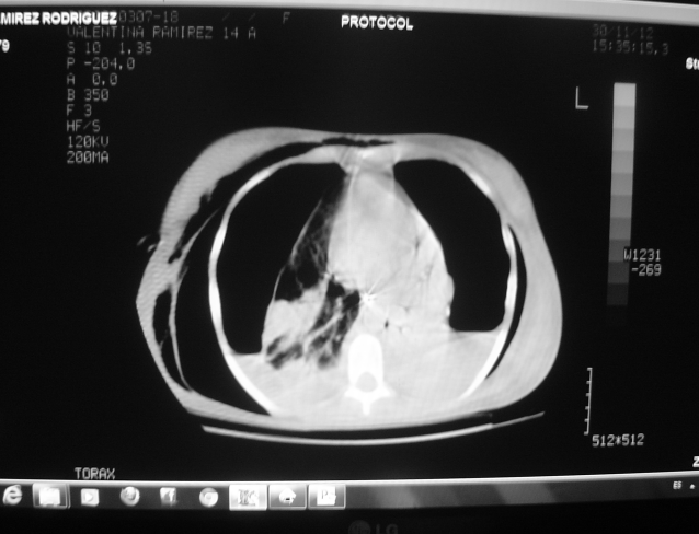 El amplio espectro clínico de la neumonía adquirida en comunidad genera problemas para su diagnóstico. La neumonía producida por Staphylococcus aureus es conocida como necrotizante, de rápida evolución y alta mortalidad. Se describe el caso de una mujer de 14 años con neumonía necrotizante por S. aureus resistente, evolucionó rápidamente a insuficiencia respiratoria requirió ventilación mecánica presento bacteriemia, empiema, neumatoceles, neumotórax bilateral persistente con fistulas broncopleurales que requirieron corrección quirúrgica. No se detectaron factores de riesgo. Los cultivos en sangre, líquido pleural, lavado traqueal fueron positivos y el tratamiento fue exitoso.